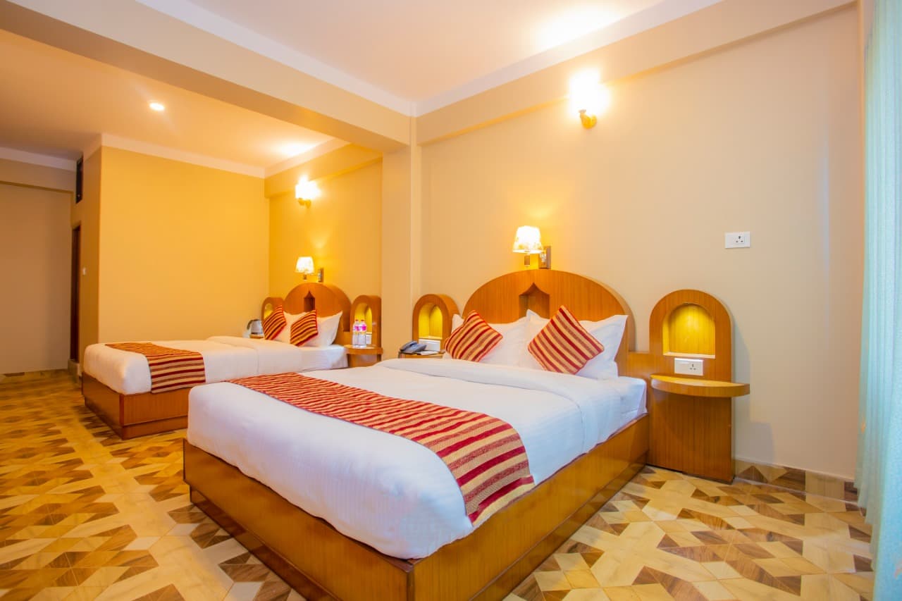A cozy room featuring two queen beds, an en-suite bathroom, and a private balcony, offering comfort and relaxation with scenic views. Perfect for families or friends.